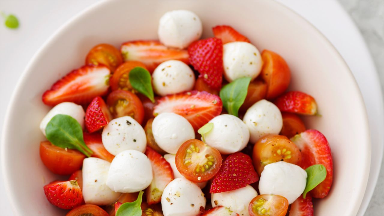 - Για τη σαλάτα με φράουλες, ντοματίνια και μοτσαρέλα βάζουμε σε σαλατιέρα τα ντοματίνια, τη μοτσαρέλα και τις φράουλες.