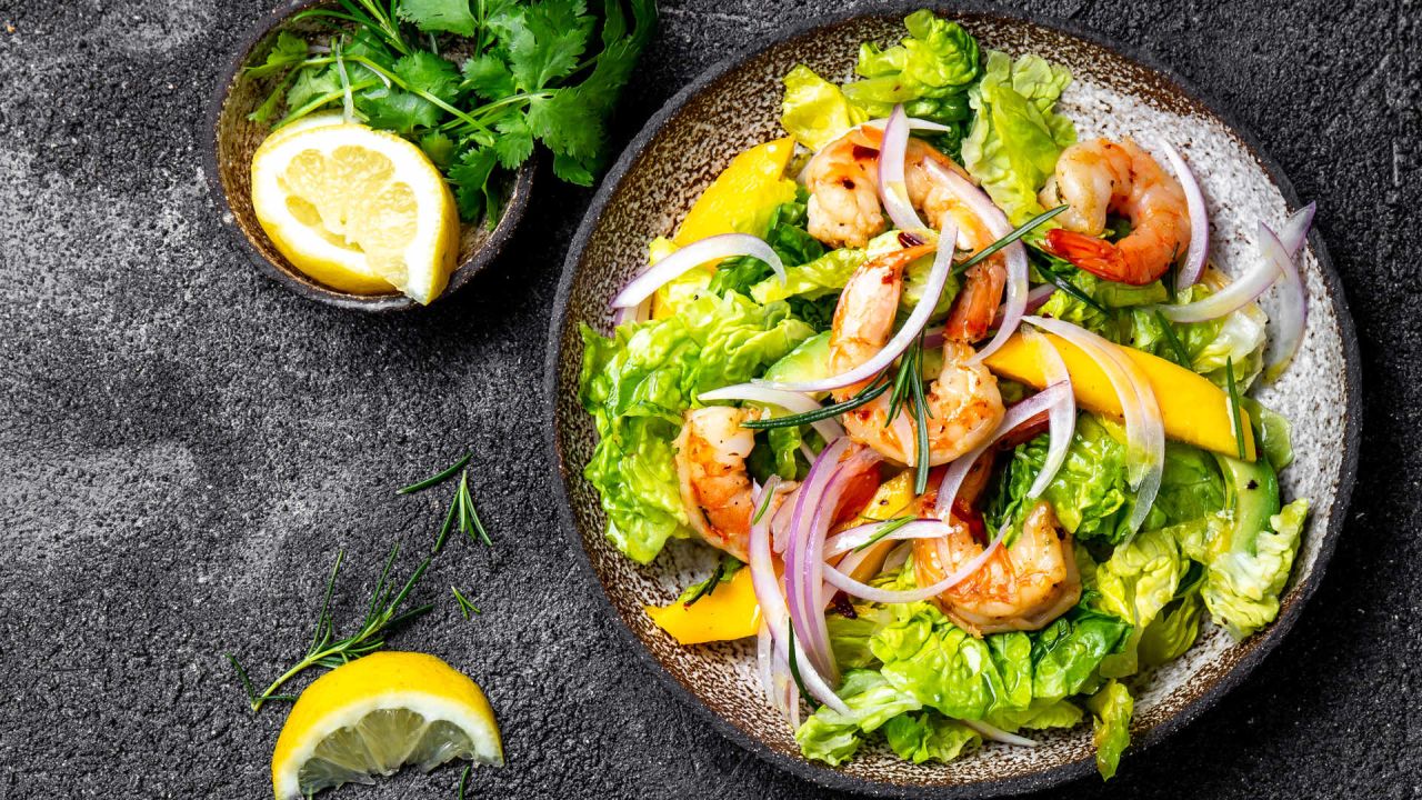 8. Μεταφέρουμε τη σαλάτα σε πιατέλα, προσθέτουμε τις γαρίδες από πάνω και περιχύνουμε τη σαλάτα με το υπόλοιπο ντρέσινγκ και σερβίρουμε.