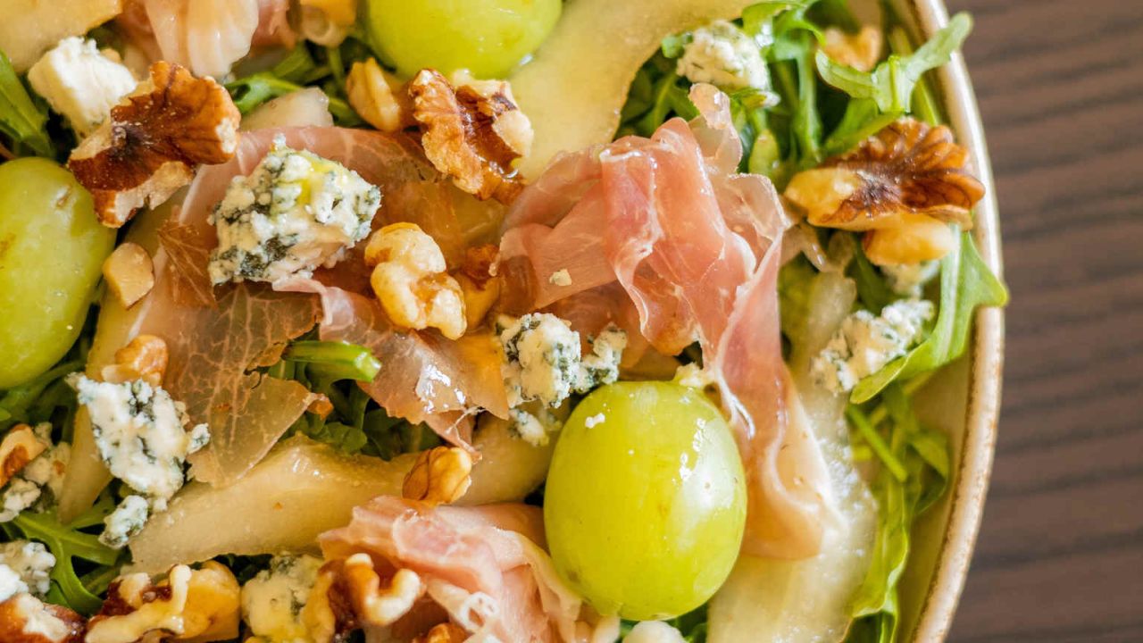 - Έπειτα προσθέτουμε τα καρύδια, το μπλε τυρί σπασμένο σε μπουκίτσες, τα σταφύλια, τον μαϊντανό, το αχλάδι και το προσούτο κομμένο σε μεγάλες μπουκιές.