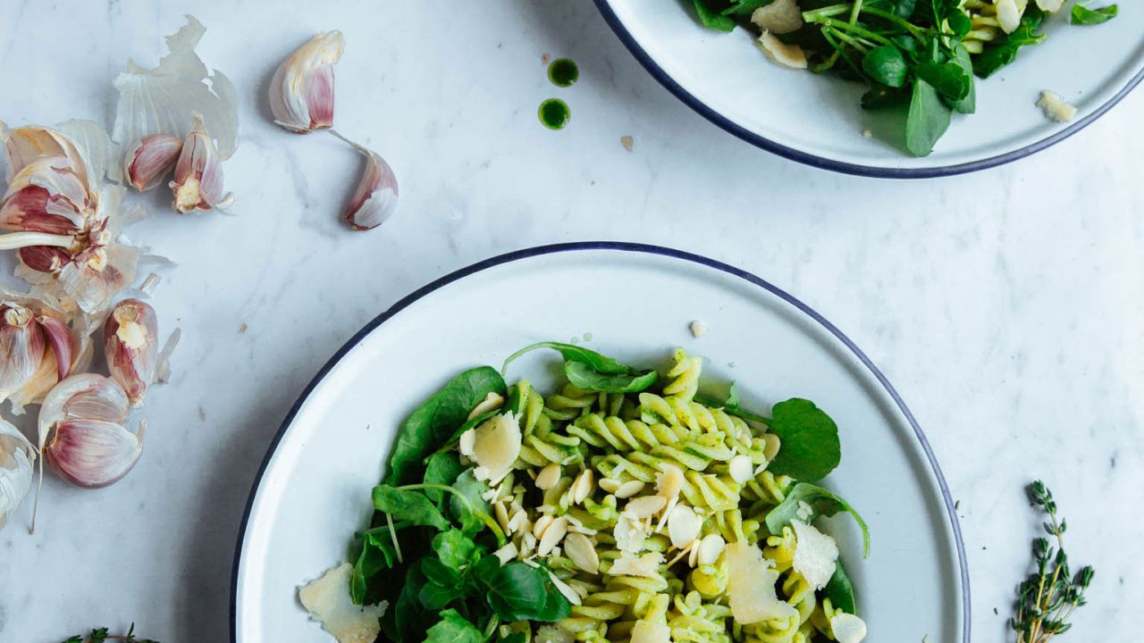 - Μοιράζουμε τη ρόκα στα πιάτα, προσθέτουμε τα ζυμαρικά και σερβίρουμε με το φιλέ αμυγδάλου, την παρμεζάνα και την υπόλοιπη βινεγκρέτ.