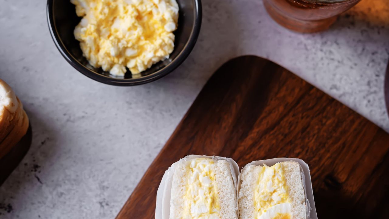 - Για το ιαπωνικό σάντουιτς sando με αυγό βράζουμε τα δύο από τα αυγά μελάτα (για 4-5 λεπτά) και μόλις τα βγάλουμε από το βραστό νερό τα βάζουμε για λίγο σε μπολ με κρύο νερό, να σταματήσει ο βρασμός. Τα ξεφλουδίζουμε προσεκτικά για να μη σπάσουν και χυθεί ο κρόκος και τα αφήνουμε στην άκρη.