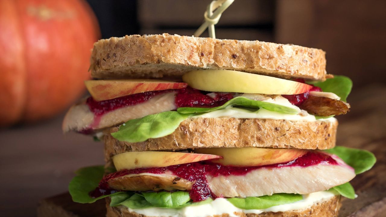 3. Συνεχίζουμε με μια στρώση γαλοπούλα που περιχύνουμε με λίγη από τη σάλτσα της επιλογής μας (cranberry sauce, chutney μήλου, bbq sauce ή μουστάρδα με μαγιονέζα) και τελειώνουμε με μερικές φέτες μήλου.