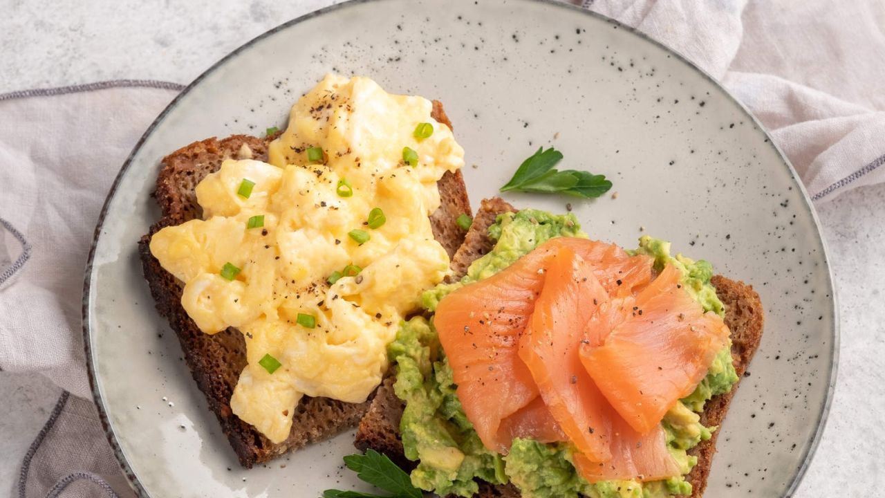 - Για τα scrambled eggs με καπνιστό σολομό καθαρίζουμε το αβοκάντο και το λιώνουμε σε ένα μπολ με πιρούνι. Αλατοπιπερώνουμε, περιχύνουμε με το χυμό λεμονιού, ανακατεύουμε και αλείφουμε με αυτό τις δυο από τις τέσσερις φέτες ψωμιού.