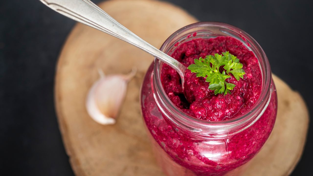 3. Προσθέτουμε το σκόρδο και τα λιώνουμε όλα μαζί να γίνουν σαν πάστα. Προσθέτουμε το κομμένο παντζάρι και τα κάνουμε όλα κρέμα.