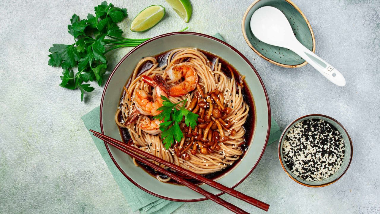 - Για τα soba noodles με μανιτάρια και γαρίδες βράζουμε τα noodles σύμφωνα με τις οδηγίες της συσκευασίας, τα ξεπλένουμε με κρύο νερό και τα αφήνουμε να στραγγίξουν.