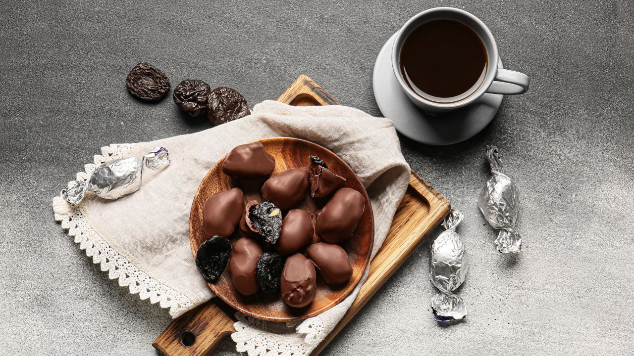 - Για τα σοκολατάκια με δαμάσκηνα και καρύδι ζεσταίνουμε το κονιάκ να γίνει χλιαρό και μουλιάζουμε μέσα τα δαμάσκηνα για 3 ώρες.