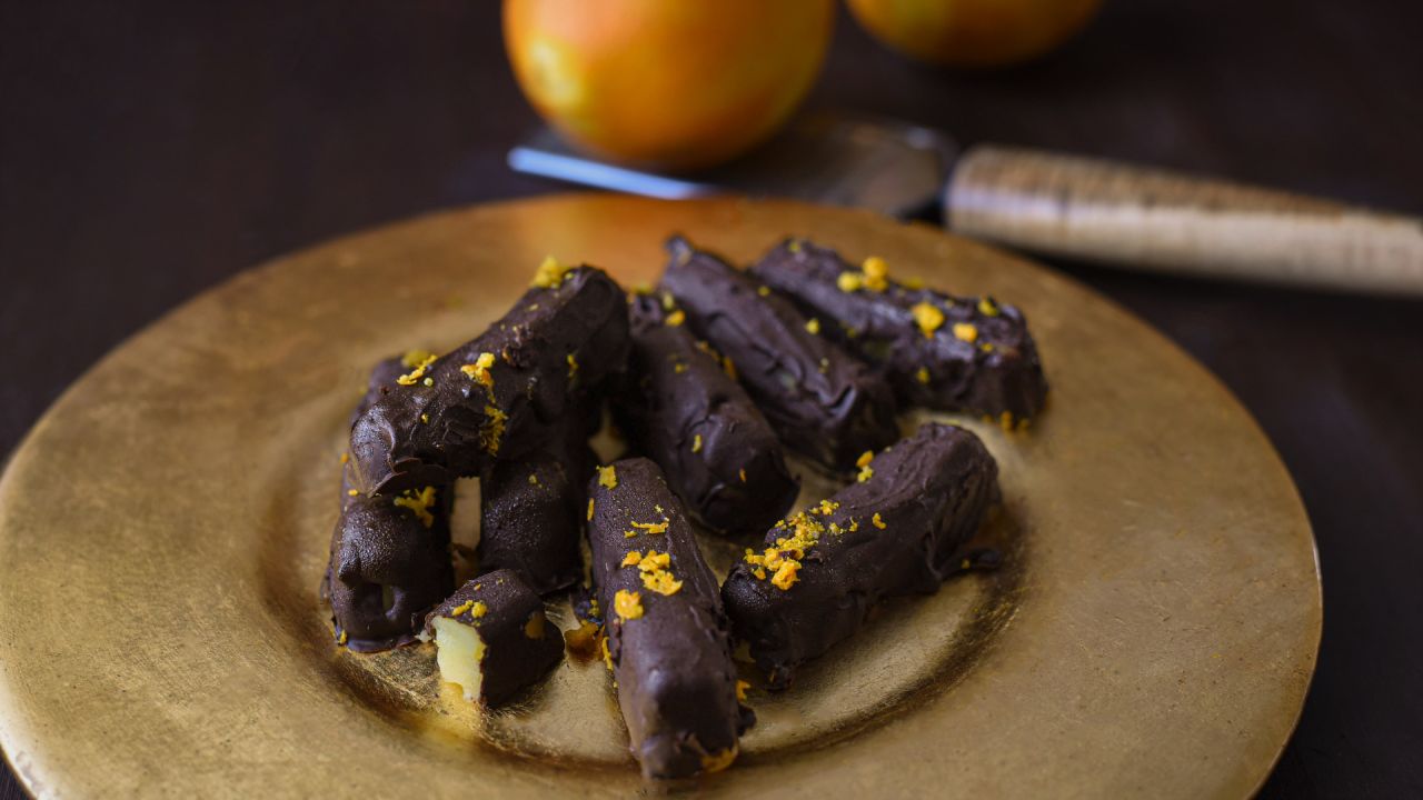 - Βουτάμε τα στικς πορτοκαλιού και μεταφέρουμε σε πιάτο με αντικολλητικό χαρτί.