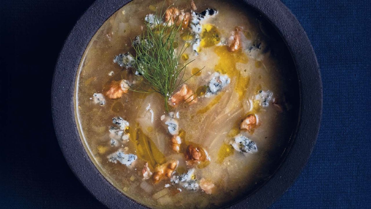 - Σερβίρουμε τη σούπα με τα καρύδια, κυανό σε τρίμματα, πιπέρι και ελαιόλαδο.