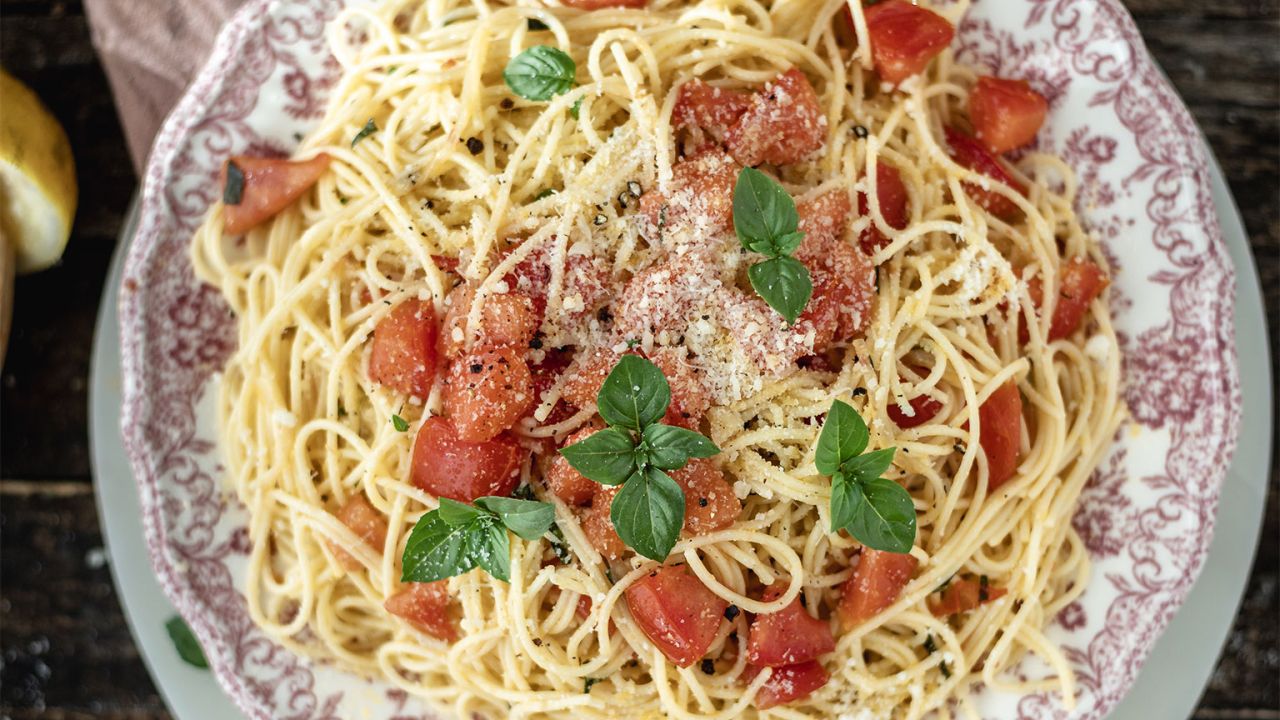- Όταν είναι έτοιμα τα ζυμαρικά, με τη βοήθεια μιας πιρούνας τα μεταφέρουμε στο τηγάνι, πασπαλίζουμε με τον βασιλικό και ανακατεύουμε καλά.