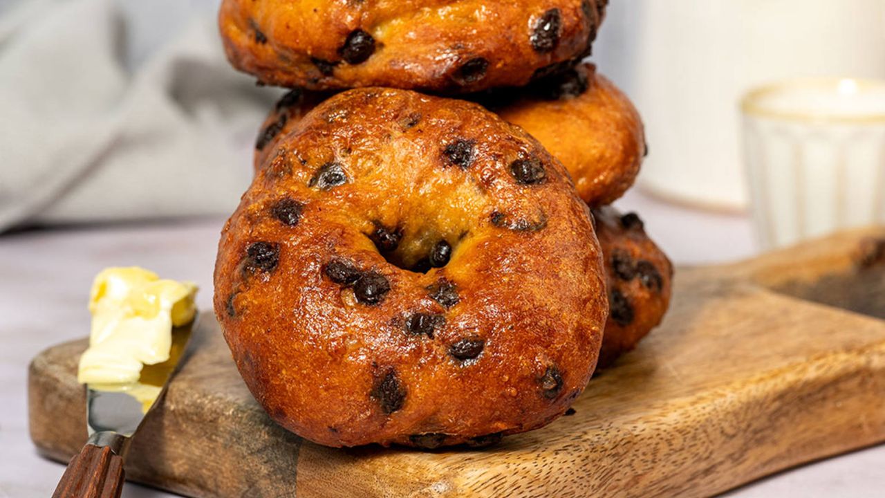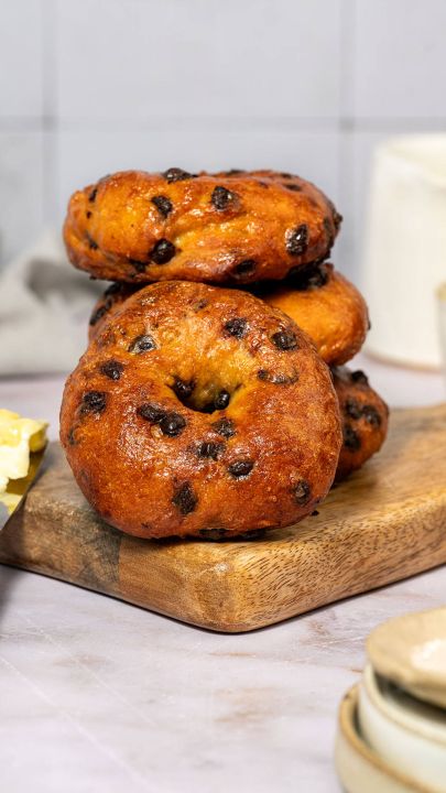 - Χωρίζουμε τη ζύμη σε 4 κομμάτια ή ανάλογα με το μέγεθος που θέλουμε να έχουν τα bagels και πλάθουμε τα ψωμάκια, δημιουργώντας μία τρύπα στη μέσα.