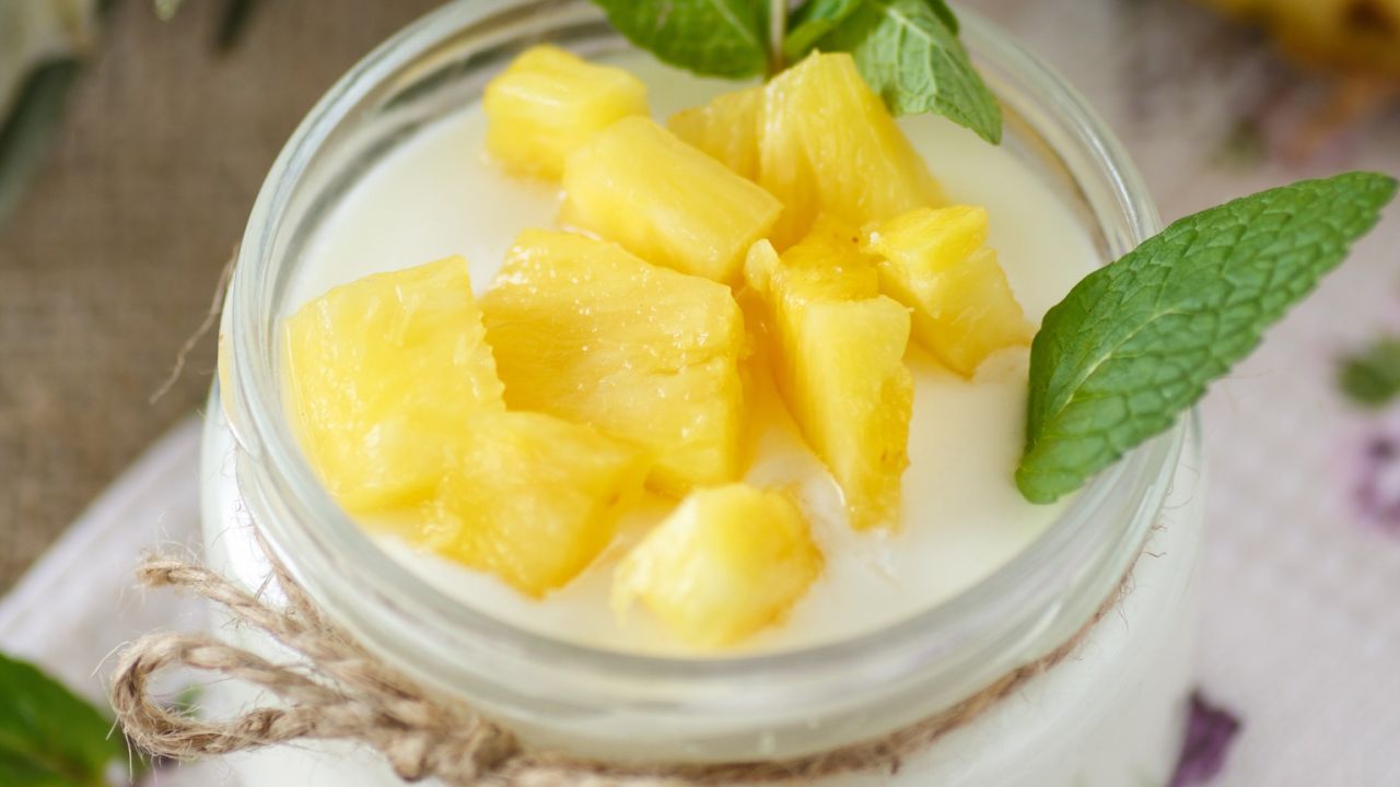 - Αδειάζουμε το γιαούρτι σε μεγάλο μπολ, ρίχνουμε μέσα το ζελέ ανανά και ανακατεύουμε πολύ καλά με σύρμα, να ομογενοποιηθούν.