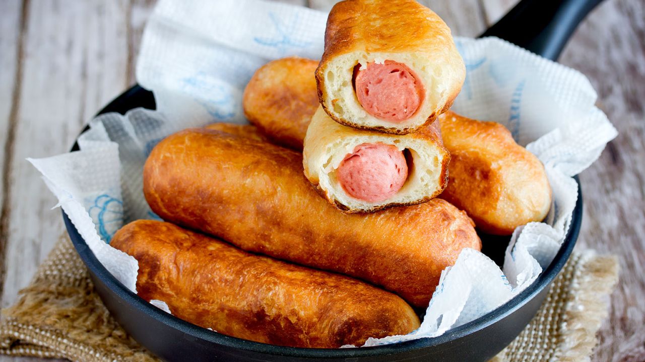 7. Πάνω σε ελαφρά λαδωμένο πάγκο ανοίγουμε το κάθε κομμάτι ζύμης σε πιτάκι και βάζουμε στο κέντρο του από λίγη μουστάρδα, λίγη κέτσαπ κι ένα κομμάτι λουκάνικο.