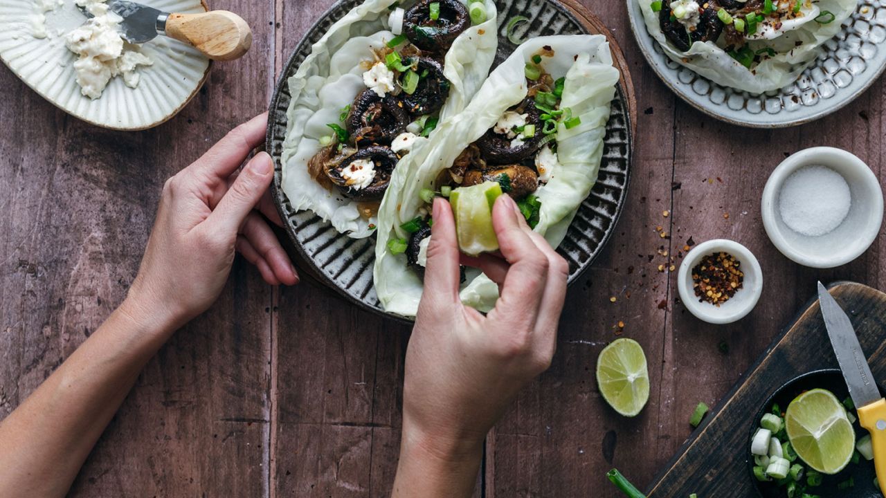 - Σε ένα φύλλο λάχανο βάζουμε μανιτάρια, καραμελωμένα κρεμμύδια, και 1 κ.γ. τυρί gorgonzola. Πασπαλίζουμε με φρέσκο κρεμμυδάκι, μπούκοβο και ραντίζουμε με χυμό λάιμ.