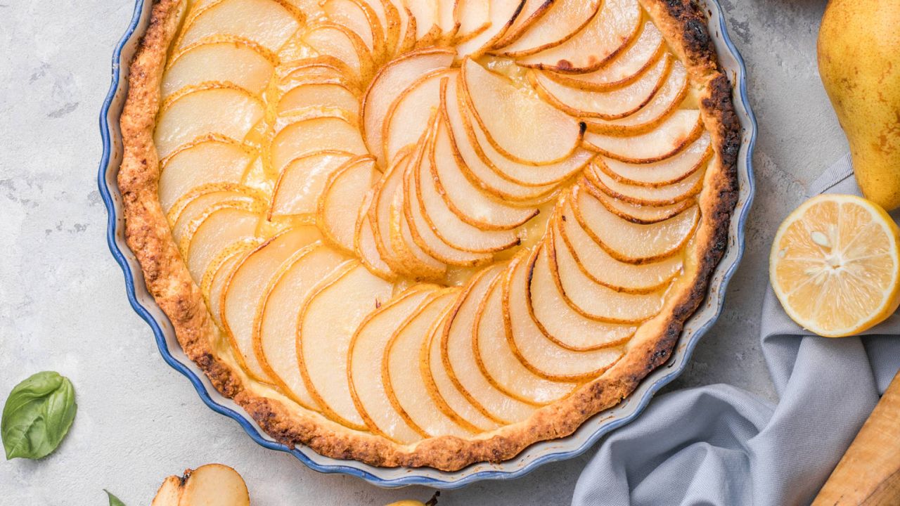 - Ψήνουμε τη βάση της τάρτας μόνη της για 15 λεπτά και στο μεταξύ πλένουμε τα αχλάδια, τα καθαρίζουμε από τη φλούδα και τα κόβουμε σε λεπτές φέτες.