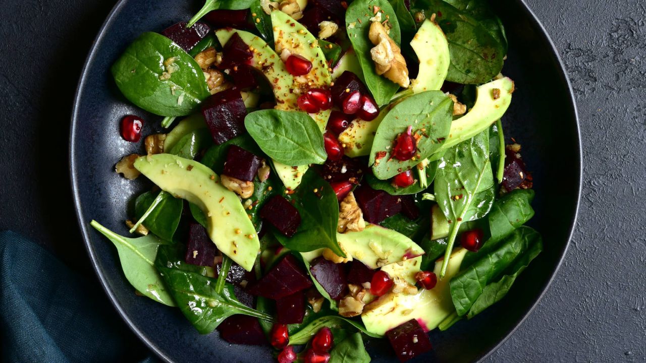 - Για τη vegan σαλάτα με σπανάκι, αβοκάντο, παντζάρι, ρόδι και καρύδια ετοιμάζουμε πρώτα τη βινεγκρέτ: ρίχνουμε όλα τα υλικά σε βαζάκι με καπάκι και ανακινούμε δυνατά.