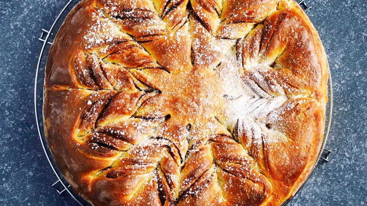 - Ακουμπάμε στο κέντρο ένα ποτήρι και με κοφτερό μαχαίρι χωρίζουμε περιμετρικά τη ζύμη σε 16 ίσα τρίγωνα. Πιάνουμε ανά δύο διπλανά τρίγωνα και τα γυρίζουμε με αντίθετη φορά το καθένα και ενώνουμε στο τέλος τις άκρες τους, σχηματίζοντας ένα «στεφάνι» γύρω από το ποτήρι.