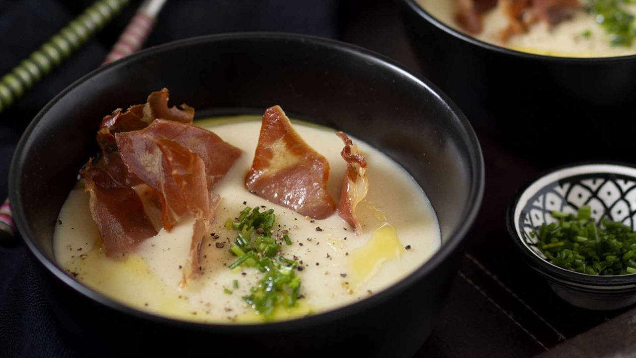 7. Προσθέτουμε το υπόλοιπο βούτυρο, ανακατεύουμε ελαφρά και σερβίρουμε τη σούπα, προσθέτοντας στο πιάτο λίγο ψιλοκομμένο σχοινόπρασο, μερικές σταγόνες λάδι τρούφας, τα chips προσούτο και φρεσκοτριμμένο πιπέρι.