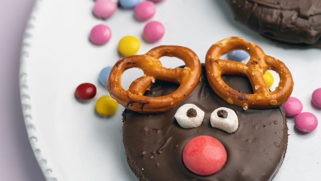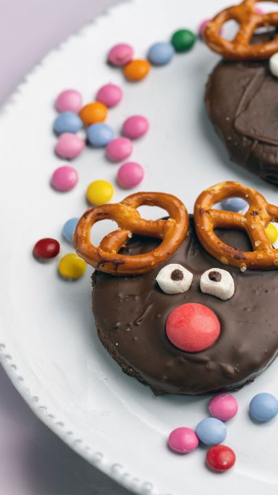 - Λιώνουμε τη σοκολάτα σε μπεν μαρί ή στο φούρνο μικροκυμάτων και βουτάμε ένα - ένα τα μπισκότα. Ακουμπάμε το κάθε μπισκότο σε αντικολλητικό χαρτί ψησίματος και όσο η σοκολάτα είναι υγρή διακοσμούμε τα μπισκότα: Με τα crackers σχηματίζουμε τα κέρατα, τα κουφετάκια γίνονται μύτη και τα mini marshmallows μπαίνουν στη θέση των ματιών. Μπορούμε να χρησιμοποιήσουμε και λίγη από τη λιωμένη σοκολάτα για τα μάτια.