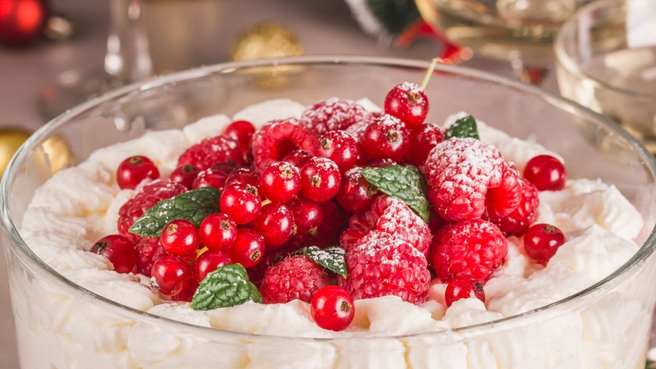 - Για το χριστουγεννιάτικο trifle με πανετόνε χτυπάμε την κρέμα γάλακτος με την άχνη και τη βανίλια μέχρι να γίνει σφιχτή, σαν σαντιγί.