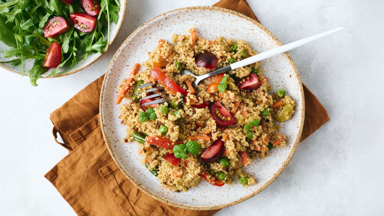 3. Στο μεταξύ βάζουμε το κουσκούς σε μπολ με 1 πρέζα αλάτι και προσθέτουμε ζεστό νερό. Σκεπάζουμε με πετσέτα και αφήνουμε για 5-7 λεπτά μέχρι να απορροφήσει τα υγρά.