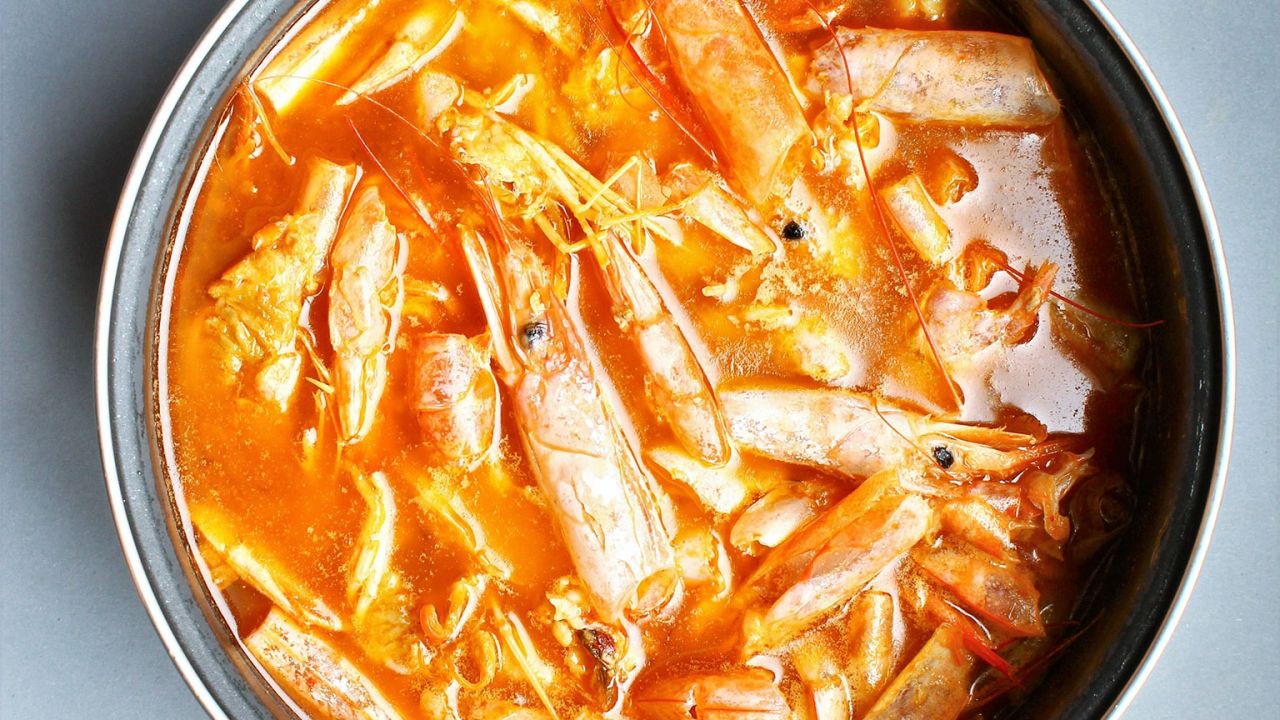 1. Για τον ζωμό γαρίδας, πρώτα τοποθετούμε μια μεγάλη κατσαρόλα σε μέτρια προς δυνατή φωτιά. Προσθέτουμε το ελαιόλαδο και στη συνέχεια τα κελύφη και τα κεφάλια των γαρίδων. Σοτάρουμε για περίπου 2-3 λεπτά, μέχρι να κοκκινίσουν και να βγάλουν τα αρώματά τους.